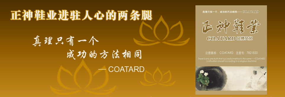 正神鞋業(yè)之所以不因自身鄙微而憂(yōu)懼,一是因為COATARD(修行)品牌承載了佛道儒三家文化三千年來(lái)永傳不變的人生成功之法則。二是因為當今充滿(mǎn)創(chuàng )造力的時(shí)代已經(jīng)觸動(dòng)了廣大的靈魂和覺(jué)者尋求自身生命也同樣具有的不曾釋放和發(fā)揮的偉大潛力!而正神鞋業(yè)的創(chuàng )立,正是為了把佛道儒三家文化三千年來(lái)永傳不變的人生成功之法則通過(guò)品牌鞋所蘊涵的民族文化與尋求自身生命偉大可能性、偉大潛能的釋放和發(fā)揮的生命個(gè)體融匯一體!使我們在日常生活與工作中的人生覺(jué)悟直接與三教文化的中心相交融,從而幫助我們找到蘊涵在自身人生旅程中的真理,去成就自己獨一無(wú)二的偉大人生和事業(yè)!